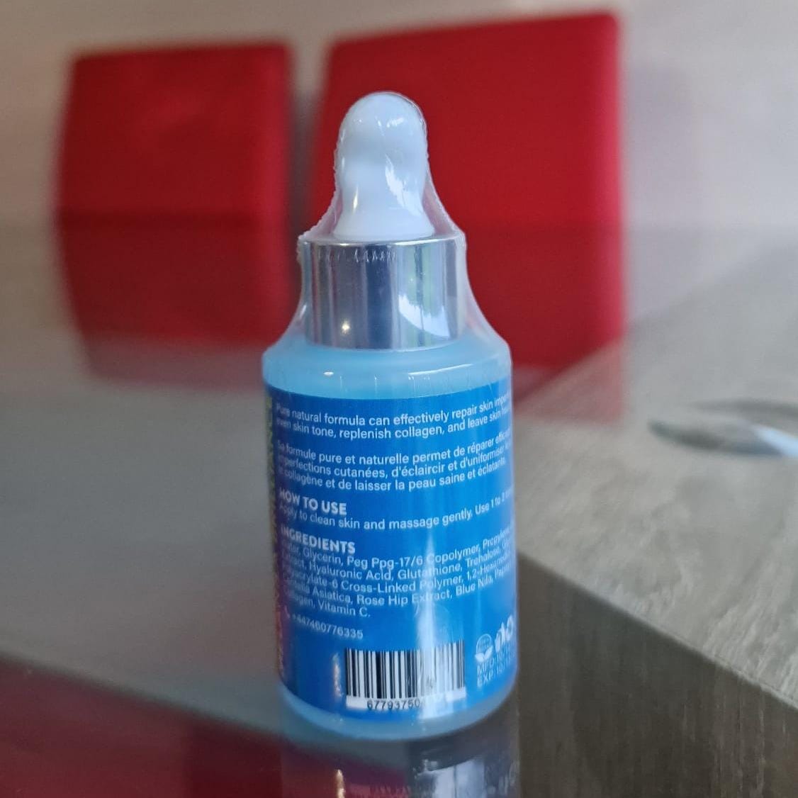 FULL INGREDIENTS: Water, Glycerin, PEG-17/6 Copolymer, Niacinamide, Hyaluronic Acid, Glutathione, Licorice Root Extract, Vitamin B (Cross-Linked Polymer), Rose Hip Extract, Blue Nila Extract, Vitamin E, Vitamin C
